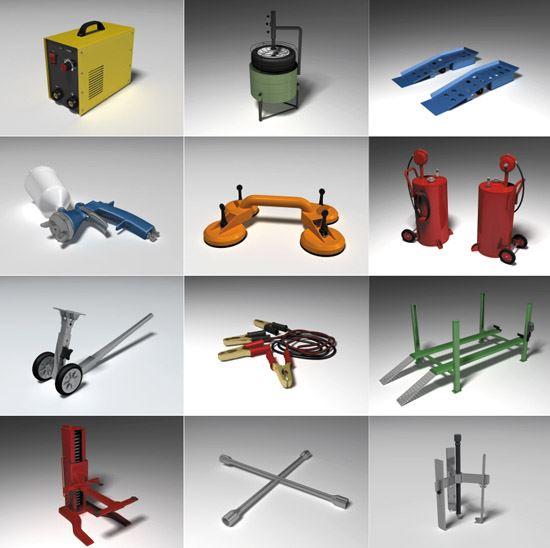 Das Produkt Dosch 3D: Car Repair Tools enthält 75 detaillierte 3D-Modelle mit Werkzeugen und Geräten zur Reparatur und Instandhaltung von Autos.