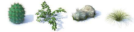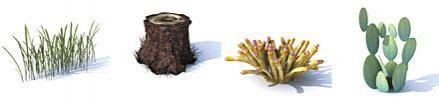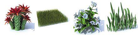 Pflanzen mit und ohne Blüten, Grasflächen und Ziergräser, Pilze, Teiche, Seerosen, Wüstenflora wie z.B. Kakteen sind Beispiele für die Vielfalt an 3D-Modellen. Zusätzlich gibt es eine große Auswahl an Bodentypen, plus Moosflächen, Steine, Baumstümpfe und sogar Unterwasserpflanzen.