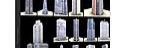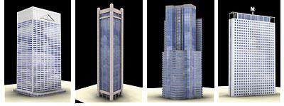 Enthalten sind klassische Formen mit geraden, klaren Linien, als auch futuristische Entwürfe mit gerundeten, zylindrischen und sogar dreieckigen Elementen. Eingesetzte "Baumaterialien" sind zumeist Glasfassaden, aber auch Beton und Stahl.