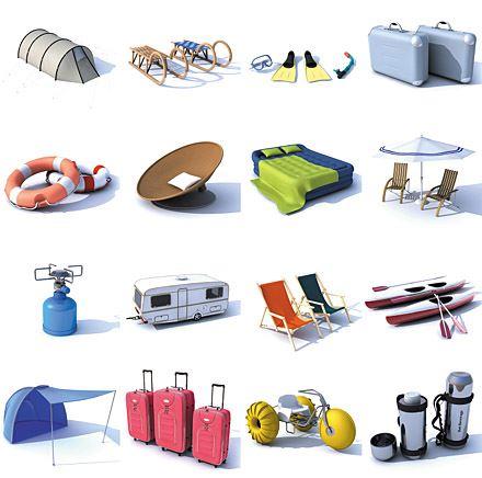 Das Produkt enthält 3D-Modelle von: Koffern, Liegestühlen, Kayak, Campingausstattung, Wohnwagen, Schlitten, Tauchflossen, und sogar Autonavigationssysteme.