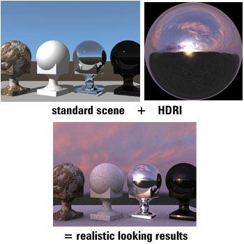 Ein HDR-Umgebungsbild enthält durch die höhere Dynamik neben der normalen Farbinformation auch die Zusatzinformation der Lichtverhältnisse. So strahlt z.B. eine im HDRI abgebildete Szene mit der realen Helligkeit und Farbgebung ab.