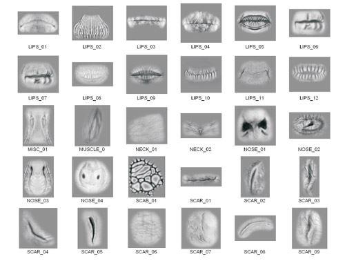 Die Elemente enthalten unter anderem: Augenlider, Fingerabdruck, Stirnpartie, Lippen, Muskel, Nasen, Narben, Wunden, Kratzer, Falten sowie eine große Anzahl Hautpartien mit Poren und Falten für Stirn, Genick, Kinn, Augenpartie etc.