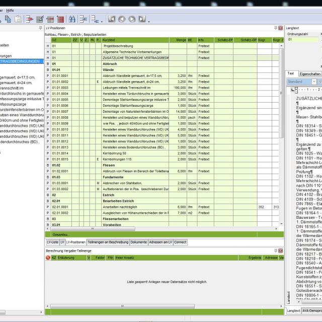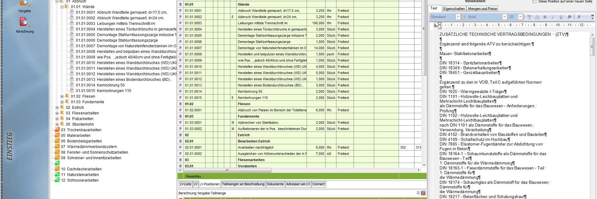 Ausschreibung, Vergabe, Abrechnung, Aufmaß, REB 23.004 (GAEB VB), MS-Office Anbindung (MS-Outlook, MS-Word, MS-Excel), Kostenauswertung nach LVs, DIN 276 und Bauteilen; Schnittstellen : DBD, Heinze BauOffice, sirAdos, StLB/StLB(Z) / RLK, STLK (Originalformat), GAEB DA81-DA86, GAEB 2000, Datanorm-Import, DBase, ASCII, Adobe PDF-Export, inkl. USB Dongle